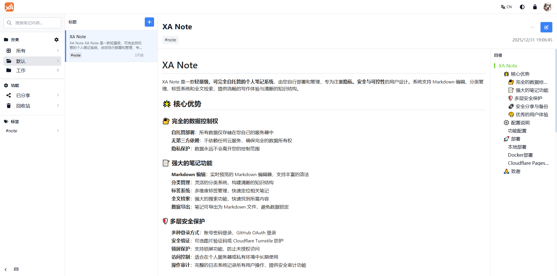 XA Note 是一款轻量级、可完全自托管的个人笔记系统,由您自行部署和管理,专为注重隐私、安全与可控性的用户设计。